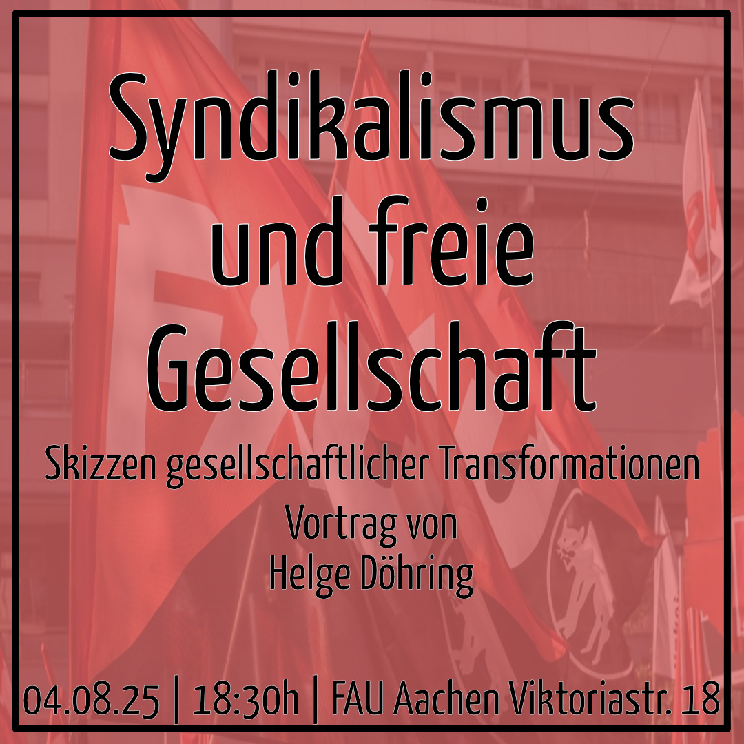 Am 04. August kommt Helge Döhring zu uns um den Vortrag „Syndikalismus und freie Gesellschaft – Skizzen gesellschaftlicher Transformation“ zu halten.